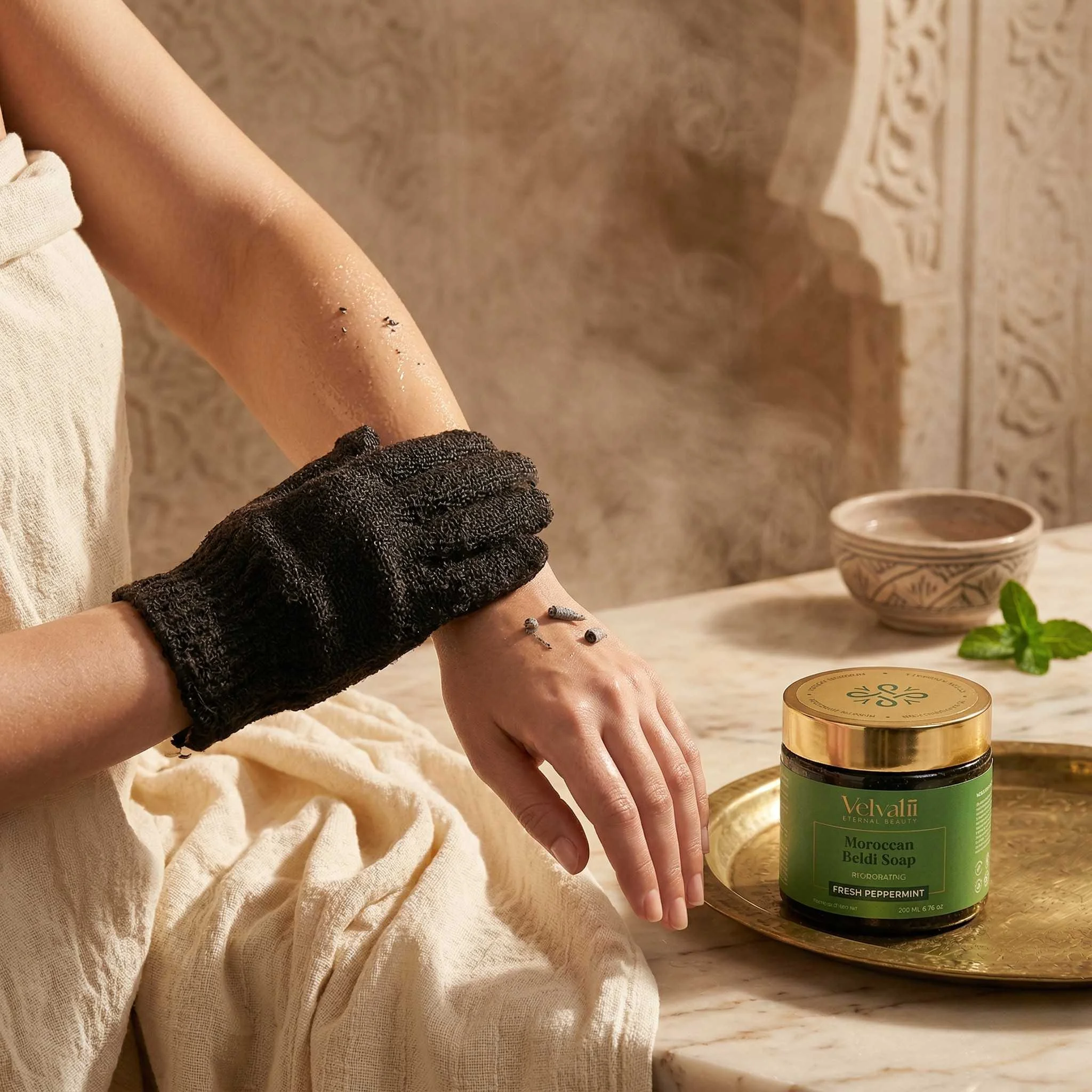 Rincez abondamment. Pour des résultats de lissage extraordinaires, faites suivre le lavage au savon noir d’une exfoliation minutieuse à l’aide du gant exfoliant marocain ou « Kessa ». Frottez par mouvements verticaux afin d’éliminer toutes les cellules mortes. Les peaux mortes s’éliminent. Votre peau est merveilleusement nettoyé, douce et soyeuse.
