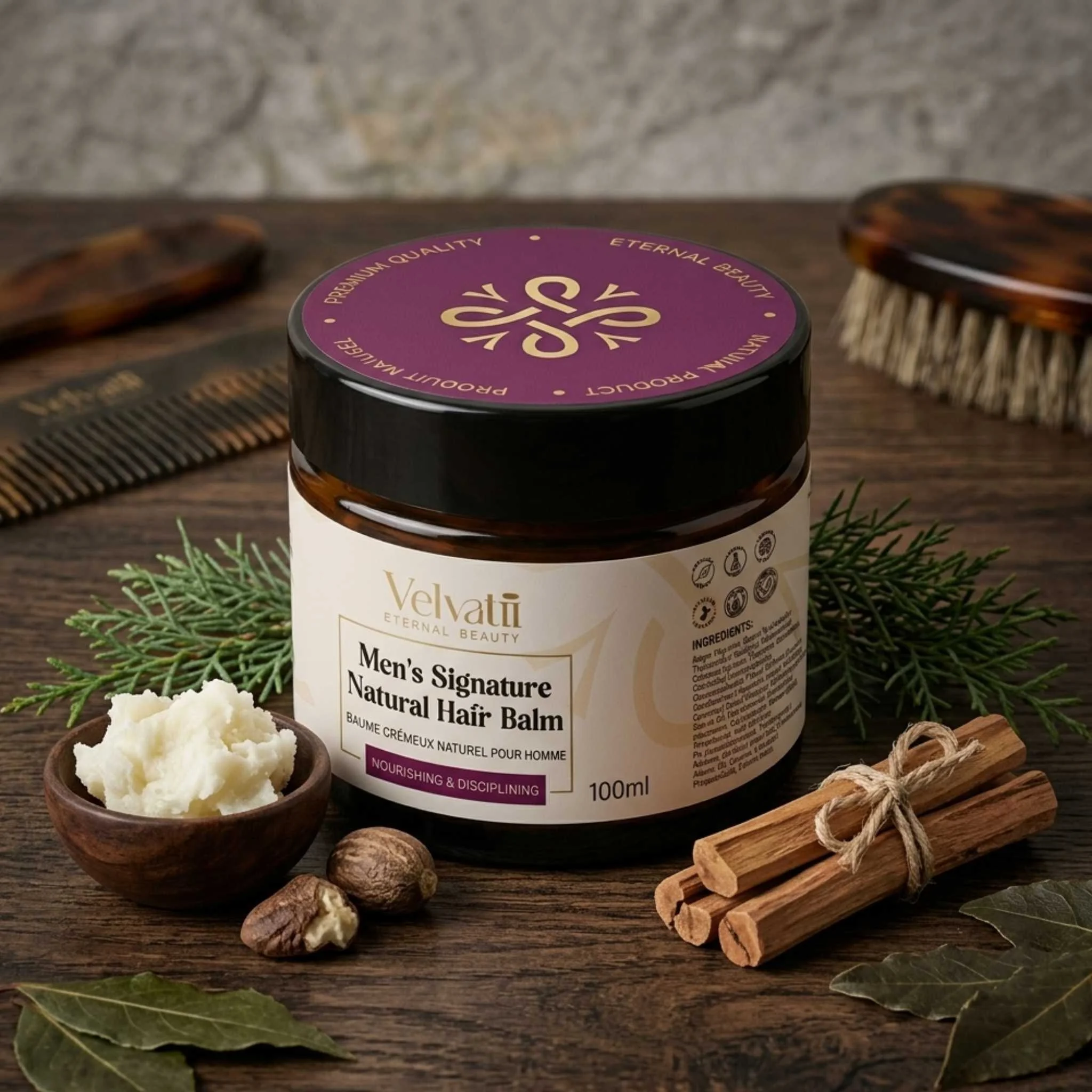 Our natural hair balm will build and amplify the health of your hair by ensuring that , and naturally scented with luxurious notes of Sandalwood and Atlas Cedar.”you maintain natural, shine, and healthy levels of moisture that your scalp needs. Your hair will be nourished, protected